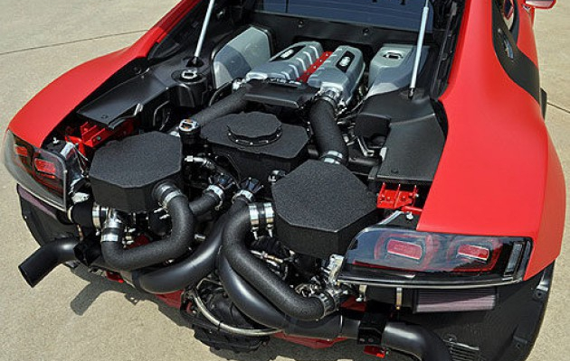 改装厂Underground Racing是个十足的涡轮控,擅长给各种自然吸气和机械增压的车型加装双涡轮增压,这辆R8也不例外,外观方面采用抢眼的消光红涂装以及黑色的轮毂。